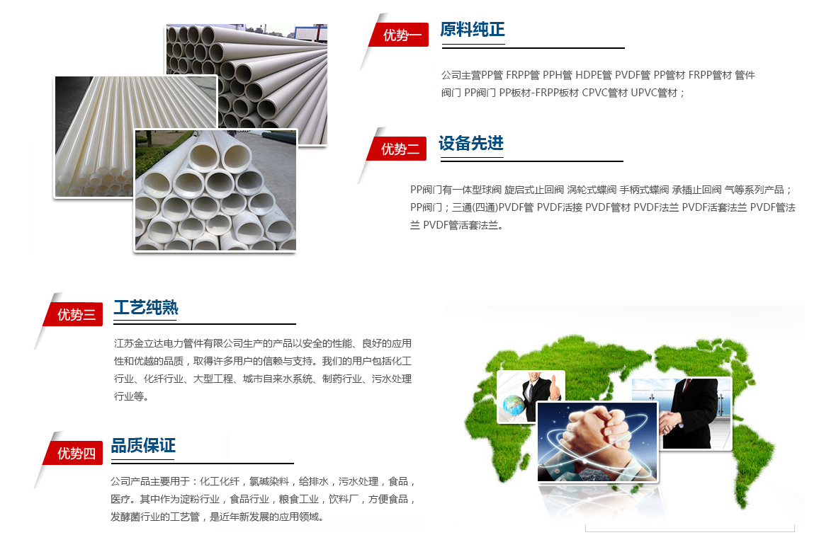 江蘇金立達(dá)電力管件有限公司專(zhuān)業(yè)生產(chǎn)PP管,PE管,PPH管等塑料管閥件,原料純正,設(shè)備先進(jìn),工藝純熟,品質(zhì)保證。公司產(chǎn)品主要用于:化工化纖,氯堿染料,給排水,污水處理,食品,醫(yī)療。其中作為淀粉行業(yè),食品行業(yè),糧食工業(yè),飲料廠(chǎng),方便食品,發(fā)酵菌行業(yè)的工藝管,是近年新發(fā)展的應(yīng)用領(lǐng)域。